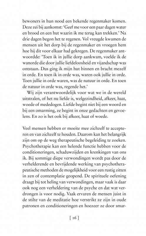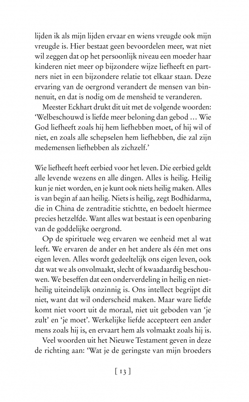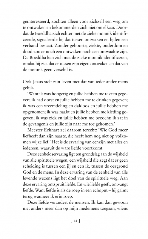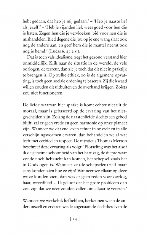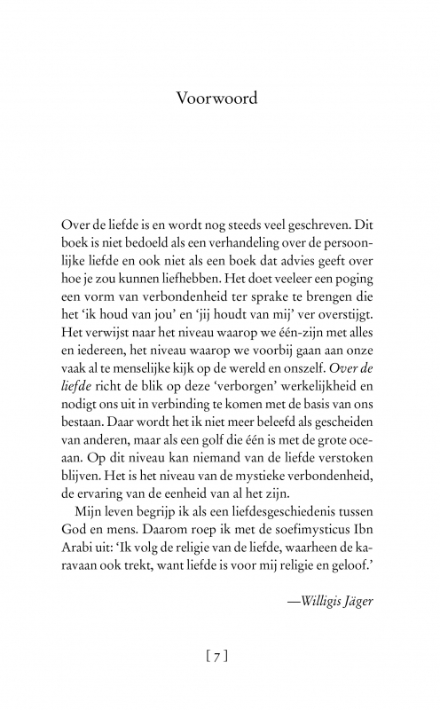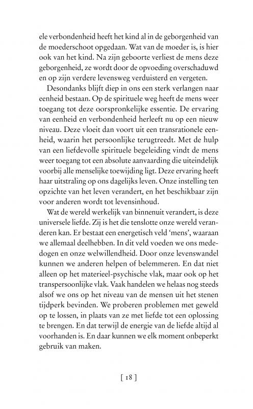 Over de liefde is en wordt nog steeds veel geschreven. Dit boek is niet bedoeld als een verhandeling over de persoonlijke liefde en ook niet als een boek dat advies geeft over hoe je zou kunnen liefhebben. Het doet veeleer een poging een vorm van verbondenheid ter sprake te brengen die het ‘ik houd van jou’ en ‘jij houdt van mij’ ver overstijgt. Het verwijst naar het niveau waarop we één-zijn met alles en iedereen, het niveau waarop we voorbij gaan aan onze vaak al te menselijke kijk op de wereld en onszelf. Over de liefde richt de blik op deze ‘verborgen’ werkelijkheid en nodigt ons uit in verbinding te komen met de basis van ons bestaan. Daar wordt het ik niet meer beleefd als gescheiden van anderen, maar als een golf die één is met de grote oceaan. Op dit niveau kan niemand van de liefde verstoken blijven. Het is het niveau van de mystieke verbondenheid, de ervaring van de eenheid van al het zijn. Er zijn nog geen recensies geplaatst. Login of registreer om een recensie toe te voegen.