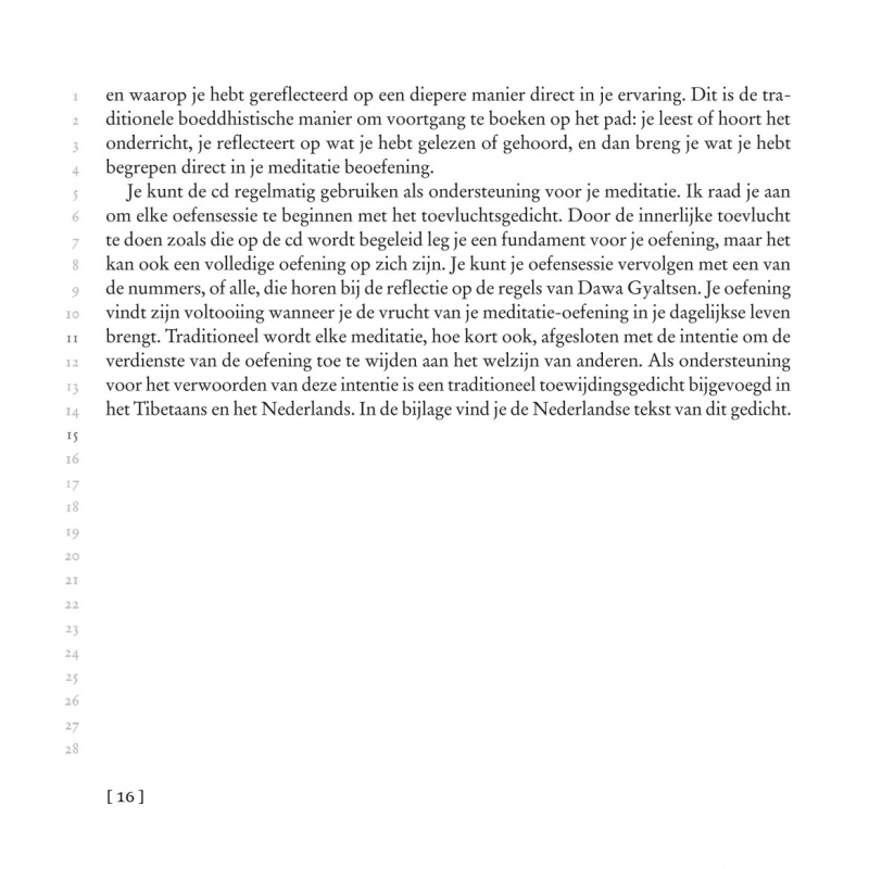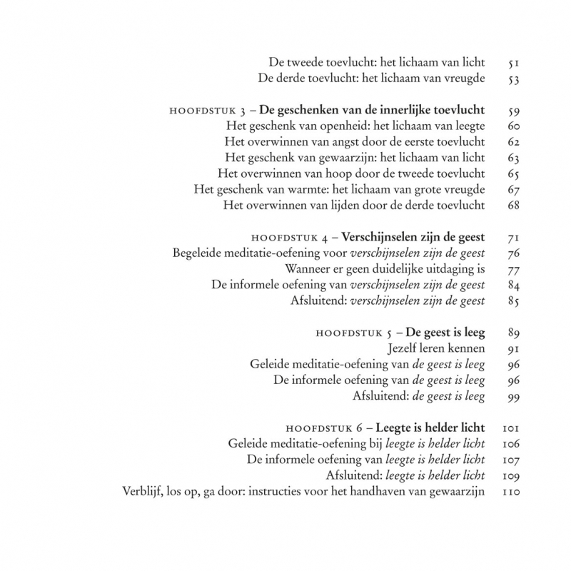 Dit is het derde boek in een reeks over geleide meditaties van de veelgeprezen auteur en leraar Tenzin Wangyal Rinpoche. In deze nieuwe titel wordt uitgelegd hoe we de beoefening van Tibetaanse meditatie in ons dagelijks leven kunnen integreren. Tenzin leert ons naar binnen te keren en onze ‘innerlijke schuilplaats’ in te gaan. Door dit te doen creëren we grenzeloze ruimte, oneindig bewustzijn en de kracht om ons leven te transformeren. Het boek met cd bevat geleide meditaties die je kunt lezen en beluisteren. Dit is een van de meest beknopte en duidelijke inleidingen om ons te verenigen met dzogchen, onze eigen geest.