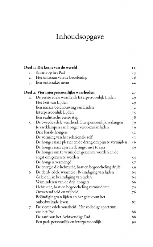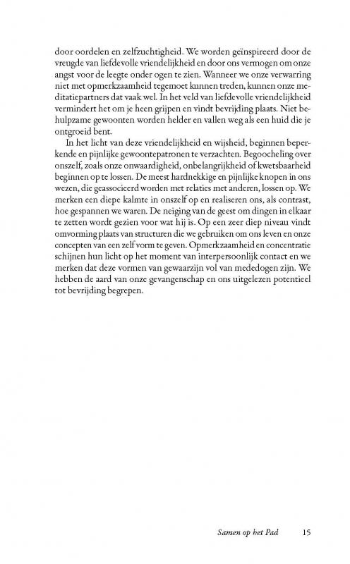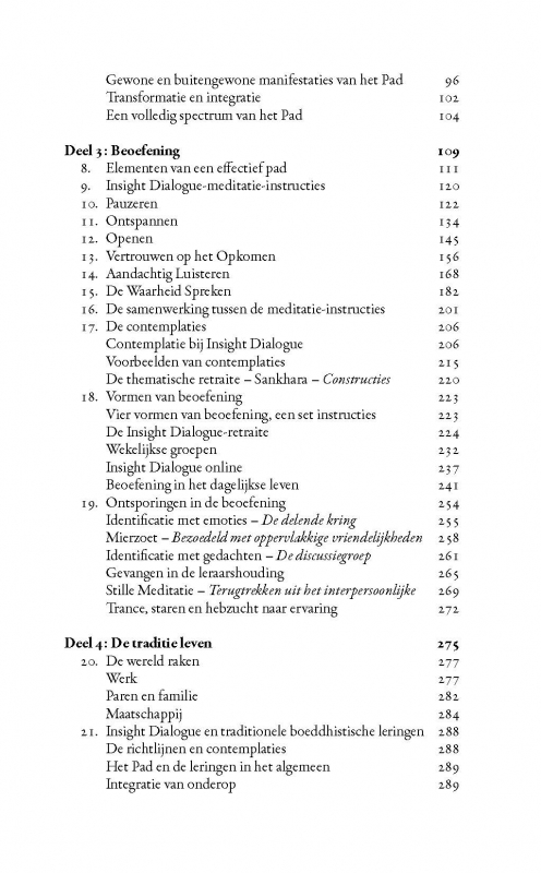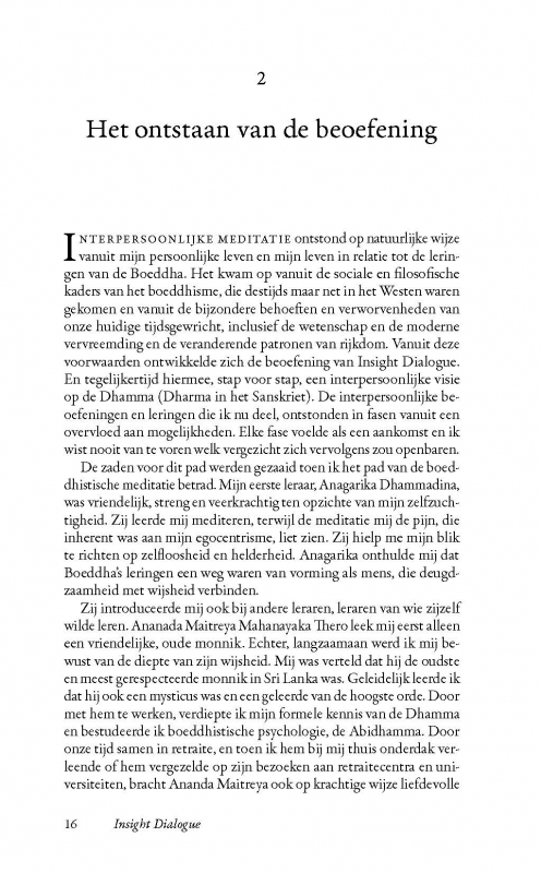 We mediteren alleen, maar leiden ons leven samen met andere mensen, een kloof is onvermijdelijk. Als ons pad zou moeten voeren naar minder lijden – en veel van ons lijden ontstaat in de omgang met anderen – dan zouden we misschien onze individuele beoefening moeten heroverwegen. Relaties kunnen de bron zijn van onze grootste vreugde en paradoxaal genoeg ook van ons grootste lijden Daarom zijn zij een rijke bron voor spirituele beoefening. Als we kalmeren en oude patronen kunnen loslaten, dan groeit ons begrip en verbetert de communicatie op natuurlijke wijze. Insight Dialogue kan worden beoefend tijdens retraites, in groepen, maar ook in ons dagelijkse leven. Gregory Kramer geeft in dit boek allerlei praktische instructies die je nodig hebt om zelf te beginnen aan dit transformatieproces. A.C. Polkerman, NBD-Biblion 16 februari 2015 Interessant boek over interpersoonlijke communicatie en de beoefening daarvan. Met name de kunst van het luisteren is belangrijk. Reductie van het menselijk lijden is mogelijk door een betere omgang met anderen en ook door een intensieve individuele training. De oefeningen zijn niet gemakkelijk, maar zijn wellicht daarom spirituele bronnen voor bewustwording en transformatie. Door het loslaten van veel oude patronen kan communicatie op een natuurlijke wijze verbeteren, met name door individuele beoefeningen en retraites. Aan het einde van het boek volgt een stille meditatie over het terugtrekken van het interpersoonlijk gebied en meditaties om de wereld tegemoet te treden op het gebied van werk, familie en relaties en allerlei maatschappelijke verbanden. Met register. De schrijver geeft sinds 1980 lessen in de boeddhistische vipassana-meditatie en biedt wereldwijd retraites aan. De uitleg en beoefening van zijn methode is waarschijnlijk herkenbaar voor ingewijden; desondanks is het boek te moeilijk voor een groot publiek. Aanbevelingen 11 december 2014 “Samen ontwaken, een intrigerend proces dat aan geloofwaardigheid wint gaandeweg het pauzeren, ontspannen, diep luisteren en waarachtig spreken. Gregory ontvouwt contemplatie in actie. Voorbij het proces van afgescheidenheid naar verbinding gaan, met elkaar. Is dat niet waar ieder mens naar verlangt? De combinatie voelt aan als uniek, gedurfd en briljant.” Jotika Hermsen, leraar vipassanameditatie