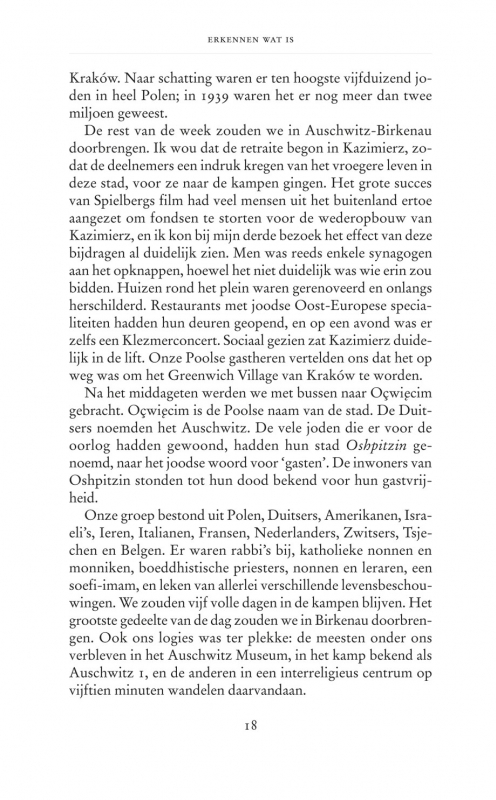 Dit boek vormt een enorme uitdaging voor onze opvattingen over wie we zijn en waarover het werkelijk gaat in het leven. Deze vrijgevige, barmhartige, liefdevolle, eigentijdse verwoording van een oude meditatieve discipline roept ons op de vrede in en om ons heen te belichamen in de wereld zoals hij is. —Jon Kabat-Zinn