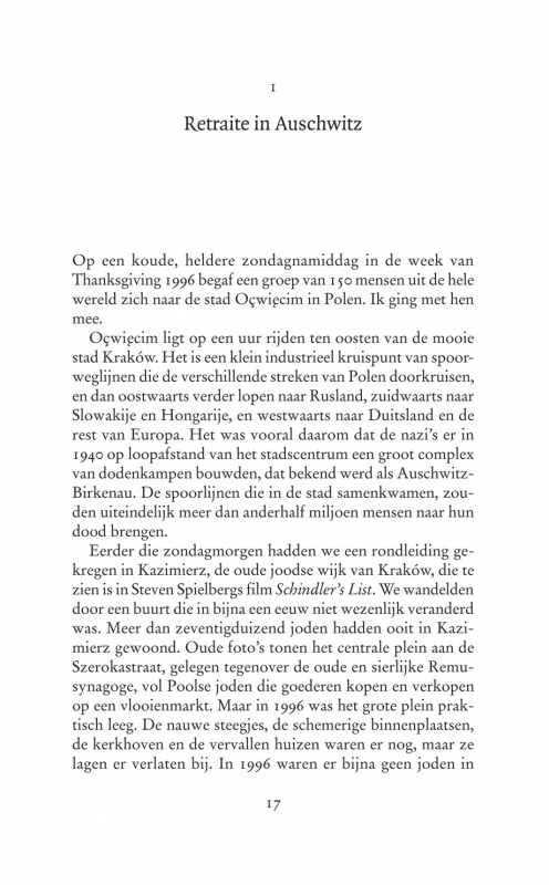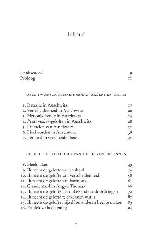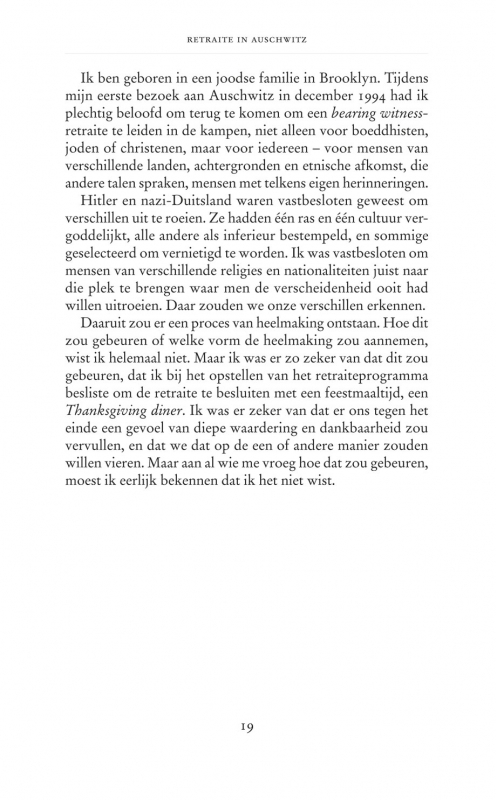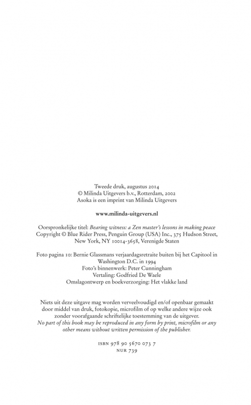 Blog Irina Verwer NBD | Biblion 8 juni 2010 In dit boek beschrijft de Amerikaans-joodse zenleraar hoe de door hem en zijn vrouw opgerichte Zen Peacemaker Orde (ZPO) tot stand is gekomen. Het werken aan vrede baseert hij op drie beginselen: niet-weten en loslaten, vreugde en lijden van de wereld erkennen, en liefdevol handelen tegenover onszelf en anderen. De directe eigen ervaring in het erkennen wat is, is essentieel; daarom ook worden bijvoorbeeld retraites in concentratiekamp Auschwitz en op straat in New York gehouden. De ervaringen hiermee worden levendig beschreven, evenals van andere leden van de ZPO, en ook wat dit betekent voor hun leven: hun werk in achterstandswijken, met daklozen en stervenden en in landen in oorlog. Bevat inhoudsopgave, enkele zwartwitfoto's van de auteur en een nawoord van de vertaler. Op de omslag een kleurenfoto van de auteur en een zwartwitfoto van Auschwitz. Zeer inspirerend praktijkboek voor allen die willen weten hoe aan de vrede in jezelf te werken en, vanuit deze spirituele (zen)basis, je zorg en sociale bewogenheid te uiten voor je omgeving en zo te werken aan vrede. Login of registreer om een recensie toe te voegen.